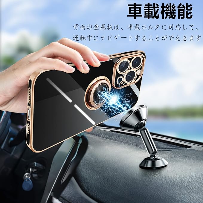 iPhone14 Pro ケース リング付き アイフォン14Pro リング カバー 耐衝撃 TPU 360°回転 スタンド機能 メッキ加工 車載ホルダー ストラップホール付き 6.1インチ(ブラック)
