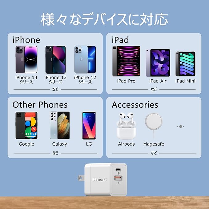 【20Wの急速充電&相性が良い】GOLDNEXT 20W USB 充電器は高速充電機能を備えた製品で、最新の充電技術を採用し、20W の電力でデバイスに効率的で高速な充電体験を提供します。 スマホ、タブレット、その他の充電デバイスであっても、この充電器を差し込むだけで急速充電でき、デバイスにより安定して高速なエネルギー供給が提供され、よりスムーズで効率的な体験が可能になります。