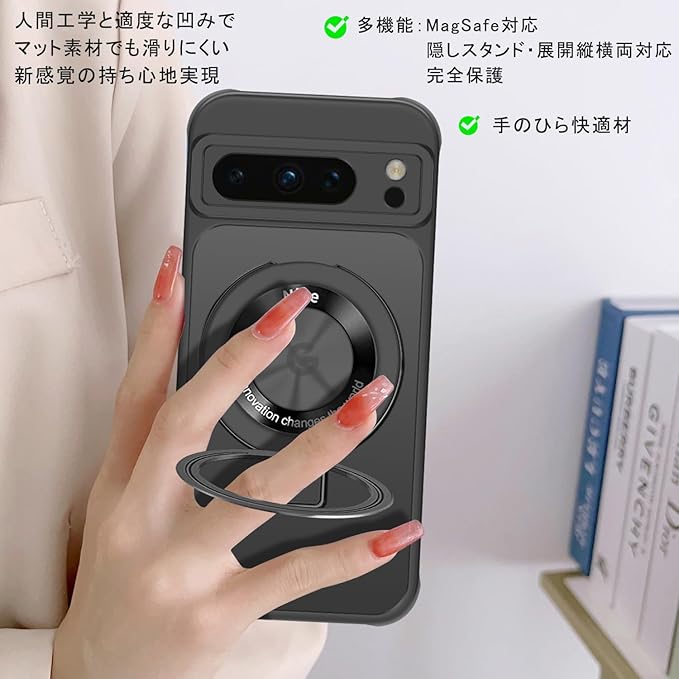 Google Pixel 8 Pro ケース MagSafe対応 スタンド ピクセル8 Pro スマホケース 半透明 ワイアレス充電対応 リング 縦横両対応 TPU 背面PC 耐衝撃 黄ばみなし Pixel8 pro カバー ストラップホール付き ブラック