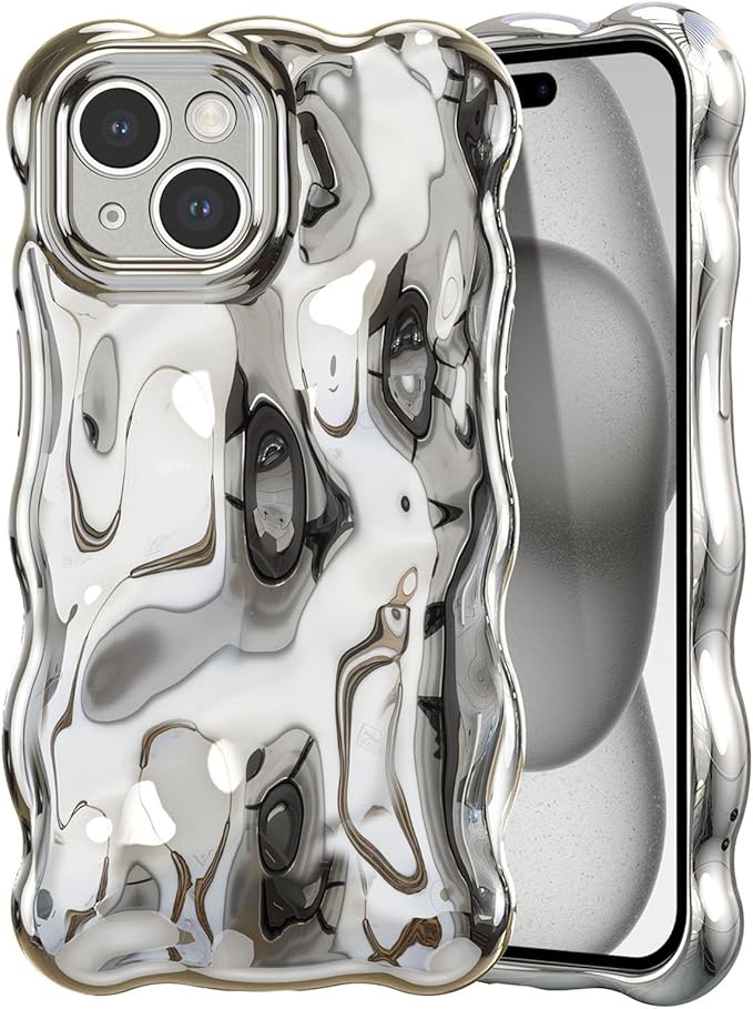 UEEBAI 対応 iPhone 15 Plus 用の ケース ウェーブデザイン スマホケース 可愛い 人気 おしゃれ ケース 薄型 軽量 グリッター 光沢カバー 耐衝撃 波型 バンパー スマホケース - シルバー