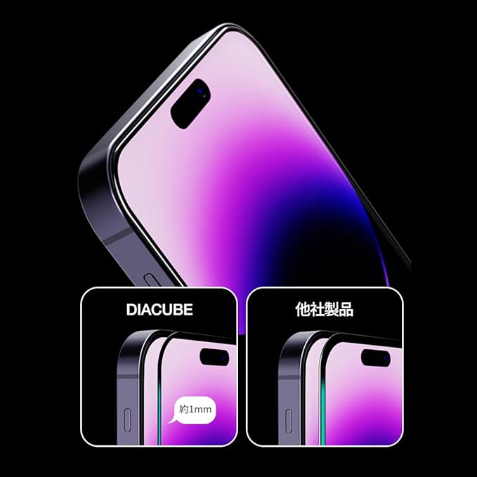 【2枚セット+ガイド枠付き】 DIACUBE iPhone 14 Pro 用 強化ガラスフィルム、3Dラウンドエッジ 硬度9H 液晶保護フィルム、 縁まで全面保護、[ほこりまで取り除く取設置フレームフレーム付き][耐衝