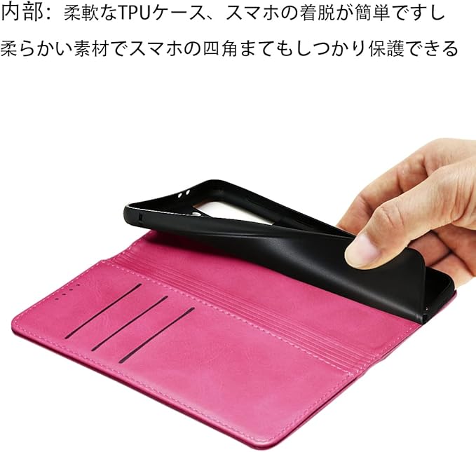 【カードポケット付き】:財布型ケースとして、名刺やお札などを入れるカードポケットがつき、ちょっとしたお出かけにもスマホケース一つでOK日常生活に便利です。ただし、カードを入れ過ぎると、閉まらない場合がありますので、ご遠慮ください。