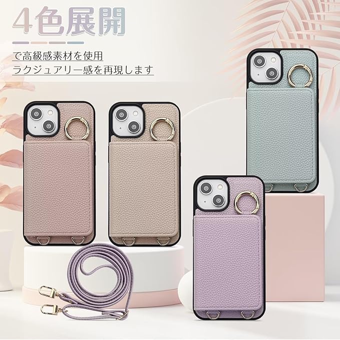iPhone13 スマホケース 手帳型ショルダー財布型 マグネットミラー付き カード/小銭収納 多機能ストラップ シンプルお洒落