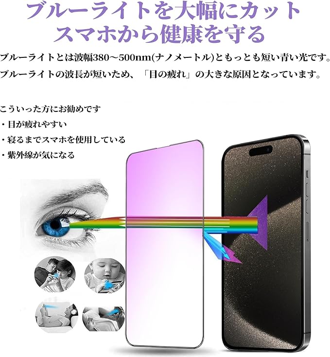 【ブルーライトカット 】 iPhone15 Pro 用 ガラスフィルム 【2枚】+カメラフィルム 【2枚】【ガイド枠付き】 液晶保護 フィルム ブルーライト 強化ガラス アイフォン 15プロ 用 (6.1インチ) 全面保護 【硬度9H/指紋防止/気泡ゼロ/飛散防止/貼り付け簡単】