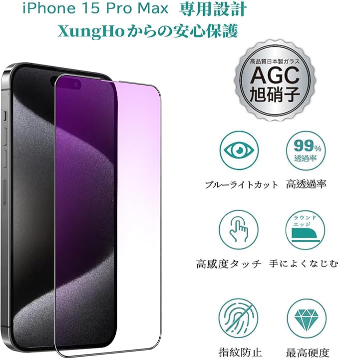 【ブルーライトカット 】 iPhone 15 Pro Max 用 ガラスフィルム 【2枚】+カメラフィルム 【2枚】【ガイド枠付き】 液晶保護 フィルム ブルーライト 強化ガラス アイフォン 15プロ マックス 用 (6.7インチ) 全面保護 【硬度9H/指紋防止/気泡ゼロ/飛散防止/貼り付け簡単】