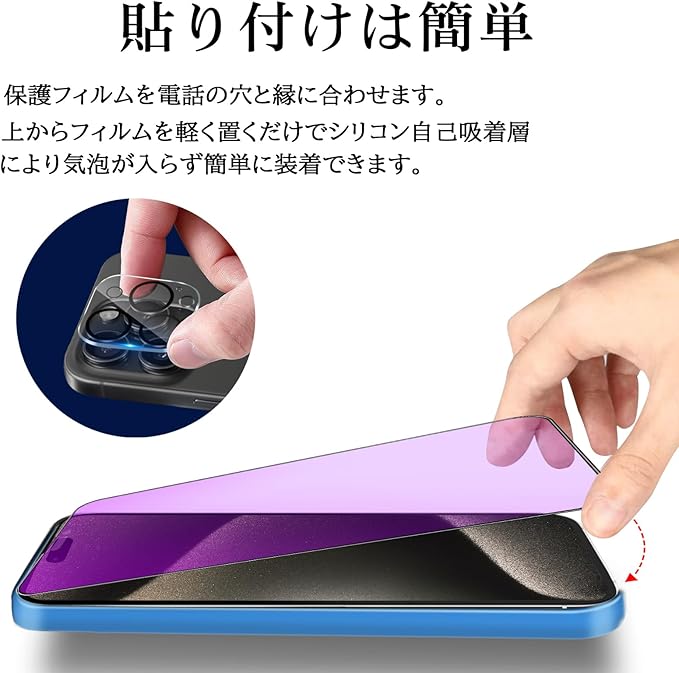 【貼り付け簡単 】ガイド枠をはめる→上側に合わせて、フィルムを置く→軽く押すだけで自然に吸着。初めての方でも簡単に貼り付けられるよう、専用の貼り付けガイド枠を同梱しています。スマートフォンと保護フイルムがズレるこ