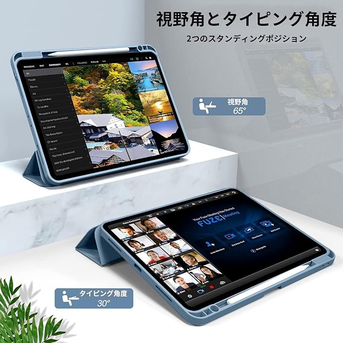?【2つの角度】三つ折りスタンドのシェルデザインは、簡単に角度を変更することができ、視聴やタイピングのニーズを満たすこ