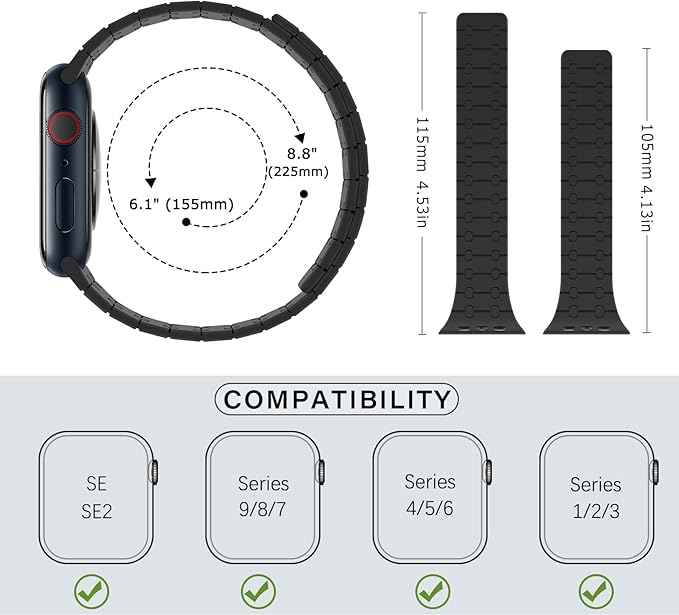 すべてのモデルに対応: ZZDZZシリコン磁気時計バンドは、Apple Watch 38mm 40mm 41mm 42mm、iWatch Series SE2/SE/10/9/8/7/6/5/4/3/2/1に対応。 6.1インチから8.8インチ(155mm-225mm)の手首に適しています。 ヒント:時計の裏側のサイズを確認し、必要に応じて正しいサイズを選択してください。