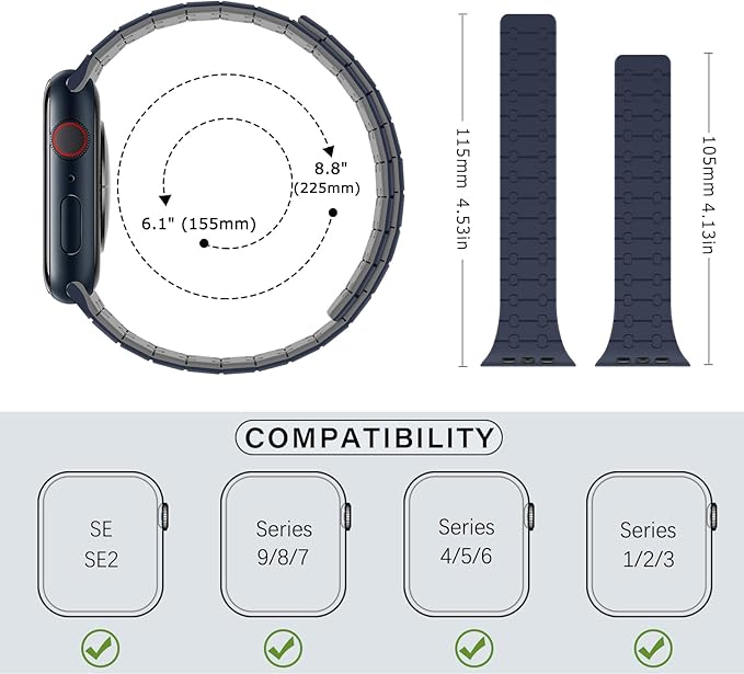 すべてのモデルに対応: ZZDZZシリコン磁気時計バンドは、Apple Watch 38mm 40mm 41mm 42mm、iWatch Series SE2/SE/10/9/8/7/6/5/4/3/2/1に対応。 6.1インチから8.8インチ(155mm-225mm)の手首に適しています。 ヒント:時計の裏側のサイズを確認し、必要に応じて正しいサイズを選択してください。