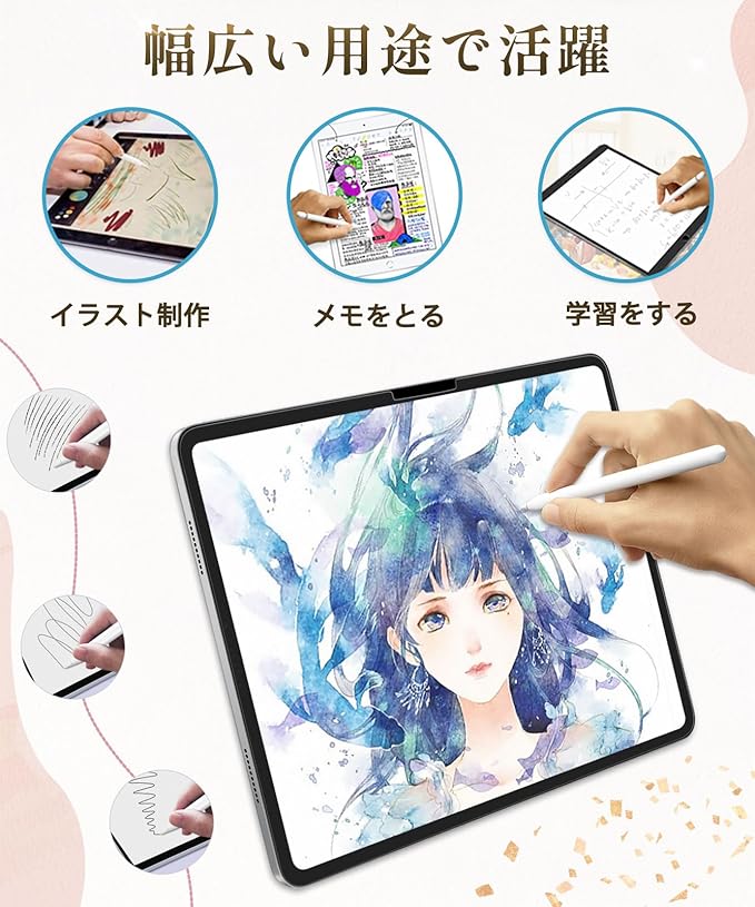 ★【紙のような描き心地】特殊表面加工により上質紙に鉛筆で描いたような描き心地を実現。 iPadで手書き作業をする人(ノート作成やイラスト)におすすめのペーパーライクフィルムです。?安い商品より圧倒的に書きやすい! さらさらした手触りで、書き味にこだわりたい方に最適です。また、表面を保護し、傷や汚れも防ぐ液晶保護フィルム(画面保護シート)です。