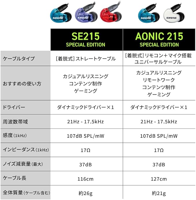 【プロ・ミュージシャンによる実地テスト済み】Shureの厳格な品質基準に基づいて設計されており。高い耐久性を誇ります。SE215SPEは、パーソナル・リスニング用に、低域を強化しつつサウンドのディテールを再現します。ゲ