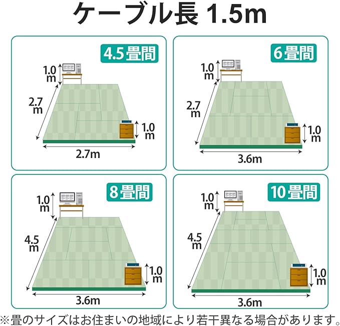 壁面のコンセントに接続してもゆとりのあるケーブル長1.5mです。