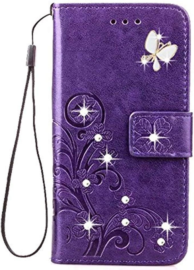 AQUOS R2 SH-03K/SHV42 ケース シン フィット アクオス R2 SH-03K SHV42 おしゃれ 純色 四つ葉のクローバーの印 PUレザー 上絵 手帳型 カード入れ AQUOS R2 SHV42 財布カバー スタンド機能 耐衝撃 防塵 耐久性 装着やすい 吸着の機能 キラキラ 胡蝶 ラインストーン デコ メチャ可愛い AQUOS R2 SH-03K スマホカバー (パープル)