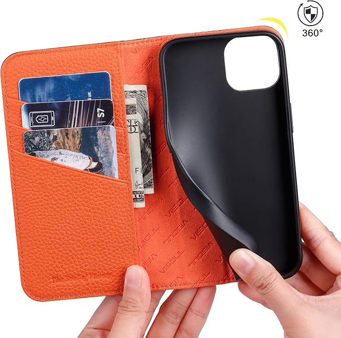 VISOUL iPhone13 ケース 手帳型 本革 レザーケース スタンド機能付き手帳型ケース カード収納 携帯ケース 全面保護 マグネット式 柔軟なTPU素材 スマホケース 6.1インチ対応 アイフォン13 シュリンクレザー アイホン13 オレンジ