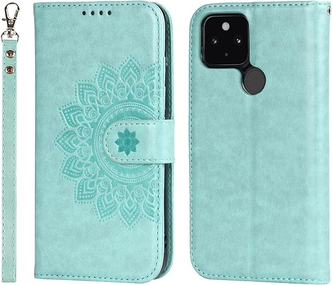 Eastwave for Google Pixel 5 ケース 財布型 for pixel5 手帳型 カバー手帳 for google pixel 5 ストラップ付き 明るい色 フラワープリント PUレザー カード収納 横置きスタンド 機能 内蔵マグネット?グリーン