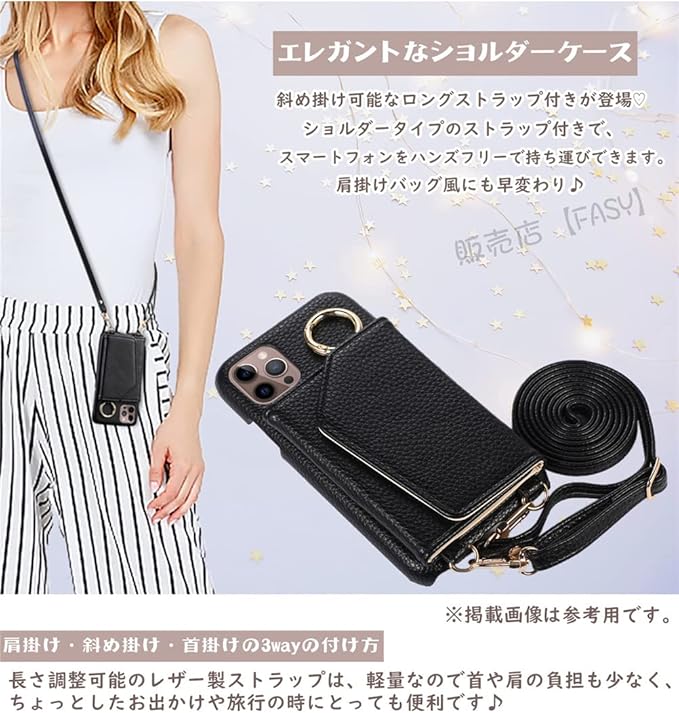 AQUOS wish ケース wish2 ストラップ ショルダー FASY アクオス wish wish2 カバー au SHG06 A104SH SH-M20 スマホケース ショルダー タイプ ミラー 鏡付き AQUOSwish スマホストラップ 肩掛け 背面手帳型 財布型 かわいい おしゃれ 革 耐衝撃 レザー スマホ 携帯 ケース ショルダー 斜め掛け リング付き ストラップ ブラック