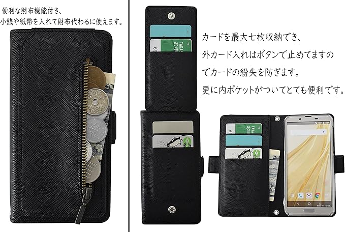 SHARP シャープ AQUOS R compact SH-M06 docomo/SHV41 au/701SH softbank 用カバー ケース 手帳型 PU レザー 横開き 収納 ジッパー付きポケット 財布型 ファスナー付き サイドフラップ 小銭入れ 上下ストラップ穴QKD-SH-M06-52-1