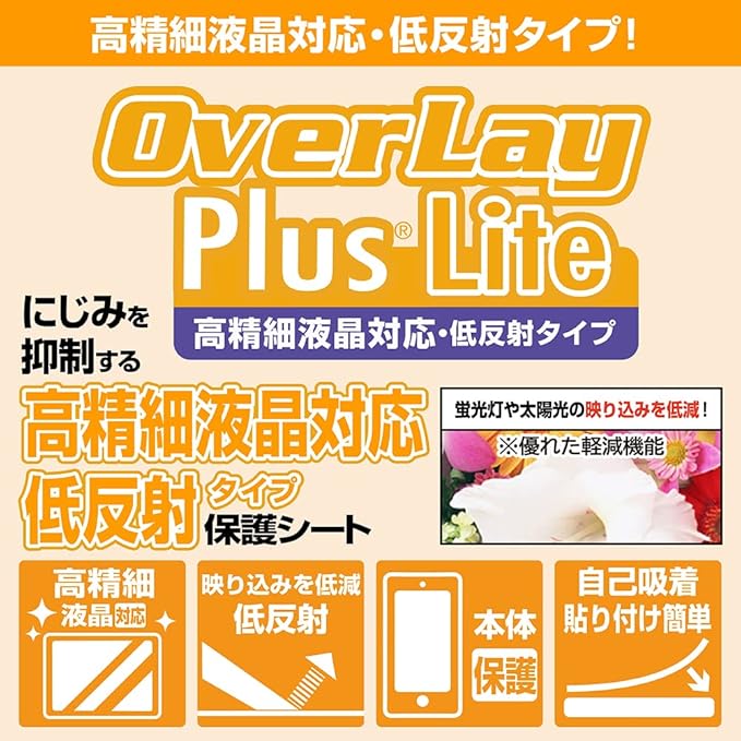 貼ったときの画面のギラツキを抑えた、高光沢に近いアンチグレアフィルムです。日光や蛍光灯の反射を抑え、画面が見やすくなる機能に加え、表面がさらさらなので指すべりもよく、指紋が目立ちません。
