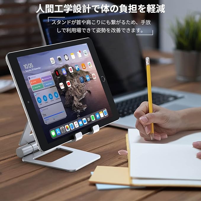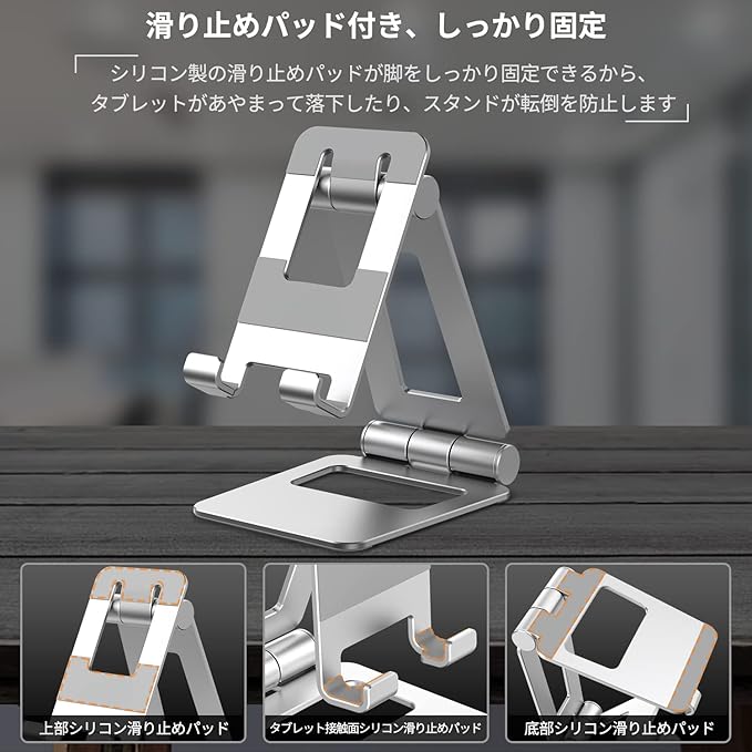 【自由に角度調整可能・滑り止めシリコン付き】タブレットスタンドは回転軸が二箇所あり、人間工学に基づいて、角度が180°/270°まで自由に調整可能で自分の好みの角度に傾けれます。シリコン製の滑り止めパッドが脚をしっかり固定できるから、タブレットがあやまって落下したり、スタンドが転倒を防止します。また、本体底面の滑り止めにより、元の機種に基づいて、サイズと厚みも強くして、進化されたスタンドで、安定でばかりでなく、スマホを保護し、傷つけにくくなリます。