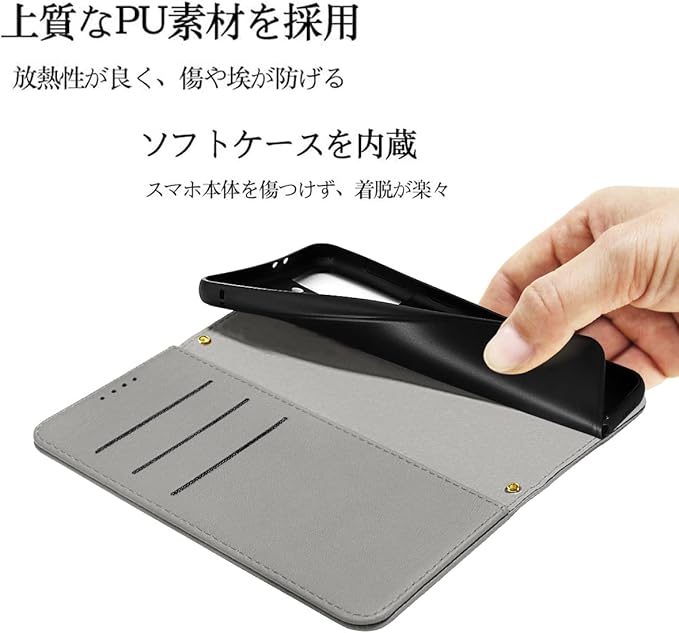 【素材】: ①外:厳選されたレトロPU革で丁寧な縫製プロセスを施し、手触りが優しくて、落ち着いた色付けで汚れにくくて、使い勝手もとても。 ②内:柔軟性が良いTPU材質のスマホホルダーです、着脱が容易,本体へ360°保護