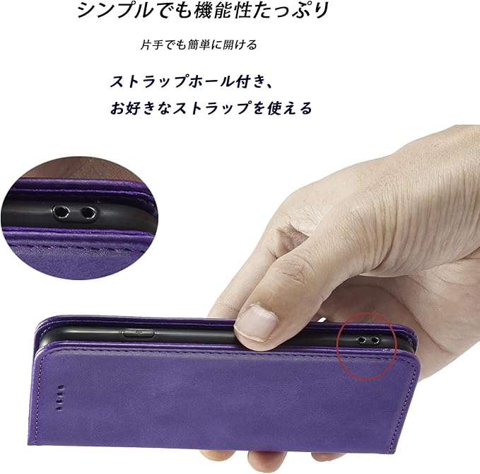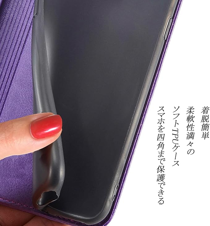 ?【素材改良】本商品の外部カバーは牛革繊維を人工合成という生産プロセスで仕上げられた合革で、普通の合革より、性能上の 耐熱性、耐摩擦が一層アップされた。表面生地が硬すぎず、やわすぎず、ちょっと良い手触りです。手汗が出てきても滑りにくく、ケースにも変な匂いがございません。インなケースは弾力性のあるソフト素材を採用しており、四角までしっかり保護でき、実用性高い手帳型です。