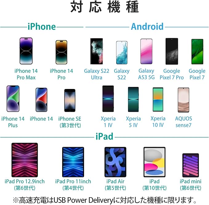 USB Power Delivery(パワーデリバリー)とは、アダプターと接続機器間で情報をやり取りすることで、その機器間における適した電力を選択し、高速充電を実現するUSB規格です。