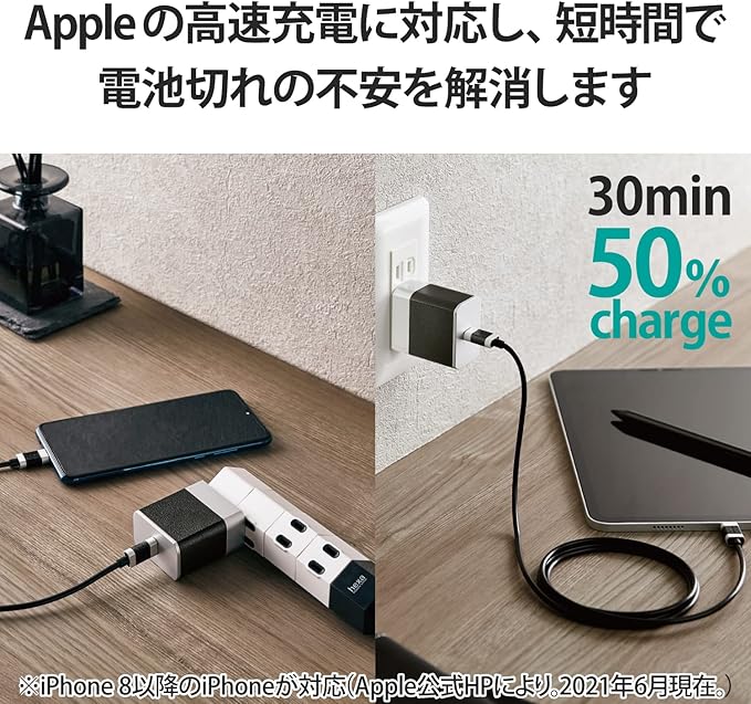 USB Power Deliveryに対応したUSB Type-C(TM)(USB-C(TM))ポートを搭載し、対応するスマートフォン、タブレットなどを超高速充電できます。