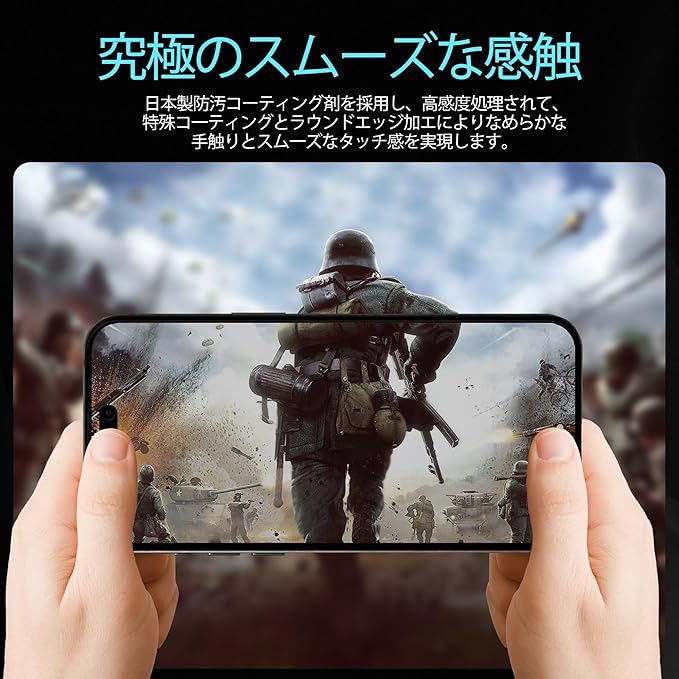 【指紋防止、高感度タッチ】ガラスフィルムには撥油コーティングが施されており、指紋や汚れなどに強くなめらかな操作感を実現、付着した汚れなどは簡単に拭きとれます。こちらは高耐久