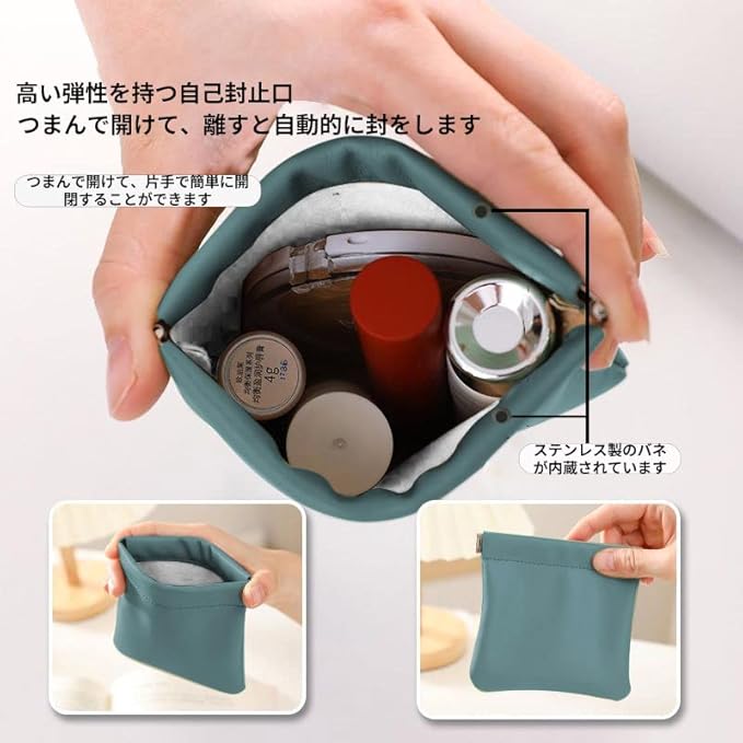 【スプリングデザイン】入り口がスプリングになっていて指で挟むと開く仕組みです。開口部にはステンレス製のポッパーが内蔵されており、開口部の両端に外側から力を加えますと、開口部にある金属片がしなって口が開き、放すと閉じる。