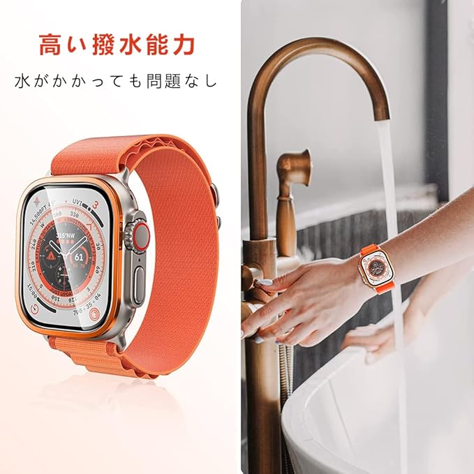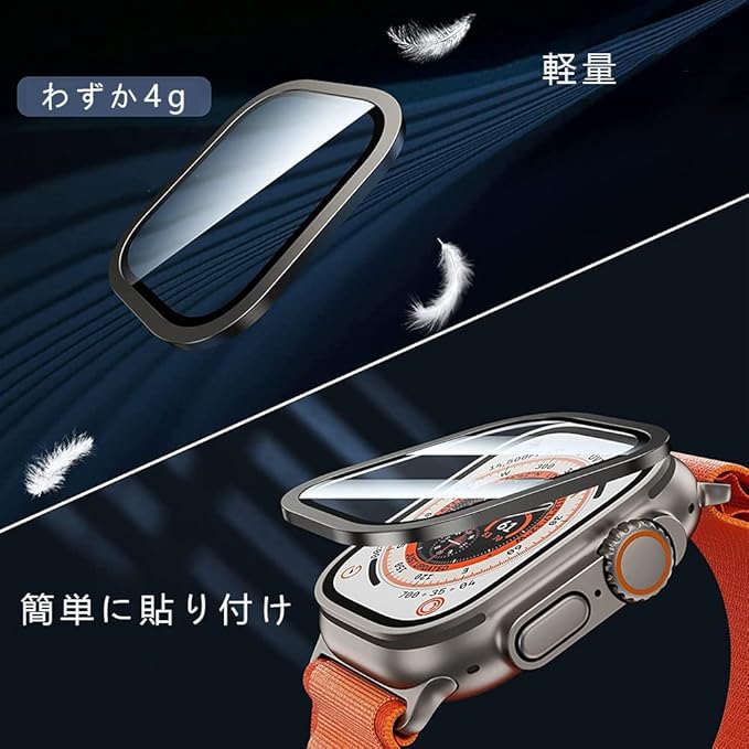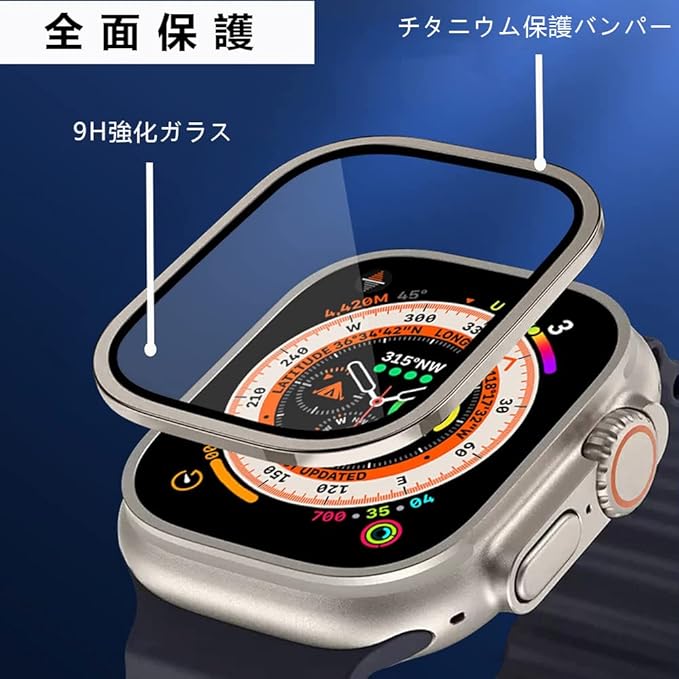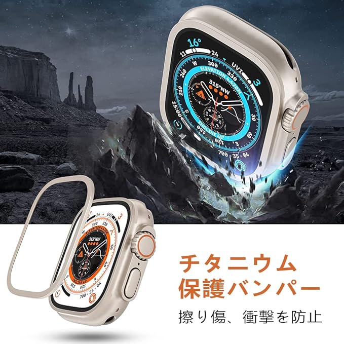 【エッジ強化チタニウム保護バンパー】apple watch ultra ガラスフィルムのエッジはチタニウムを採用します。日常生活、スポーツ等、アップルウォッチの縁への擦り傷、衝撃や摩耗を防止します。