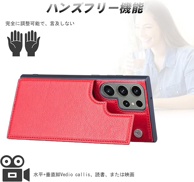 【自由の機能さ】ケースを装着ままで携帯のボタンを全てスムーズに使用し、スマホケースは自由に調整できる横置きスタンド機能が付き、、横向いて斜めに立てて、お好きな角度を調整でき、両手が解放され、お気軽に読書やビデオの観賞を楽しむことができます。
