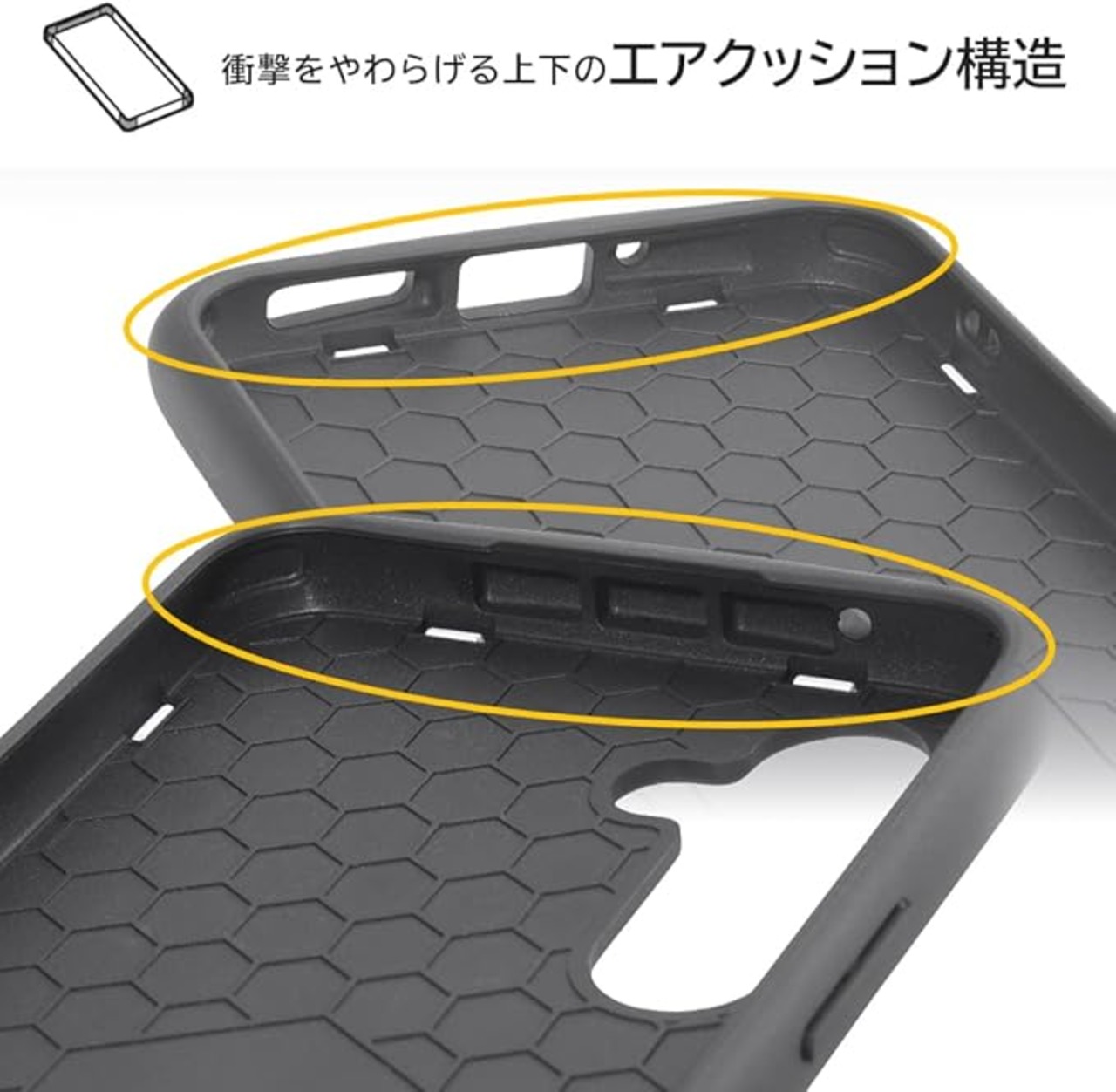 ケース上部と下部は衝撃をやわらげるエアクッション構造。画面を下向きに置いても傷が付きにくい。カメラレンズに傷が付きにくい。