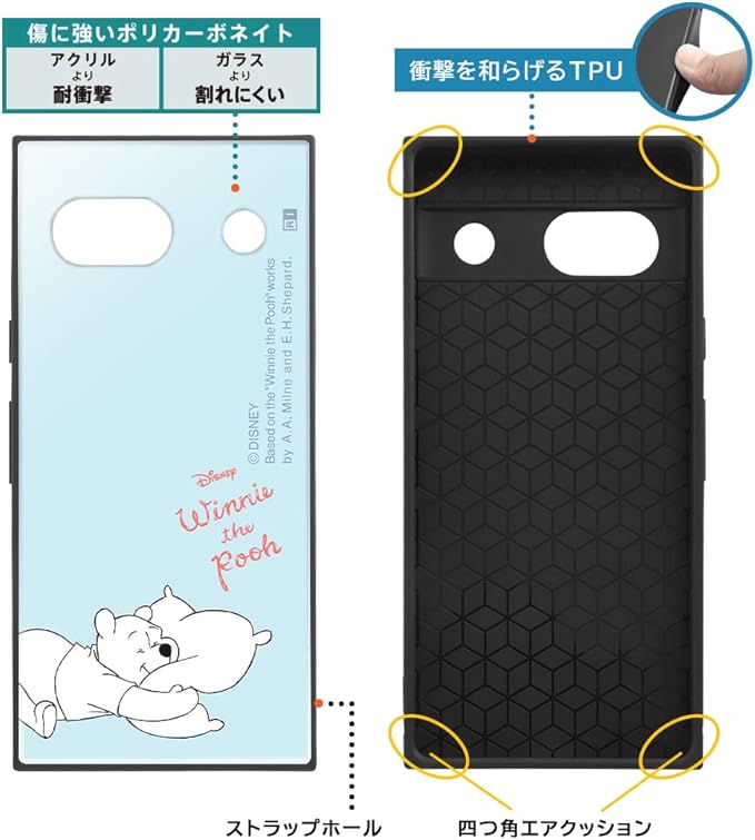 (C) DISNEY Based on the"Winnie the Pooh"works by A.A. Milne and E.H.Shepard. 個性的な四角いフォルムと、衝撃に強いTPU素材の側面、薄くて軽く透明度の高いPCパネル を背面にセットした Google Pixel 7a 用 耐衝撃ケース KAKUハイブリッド。端末側面保護、衝