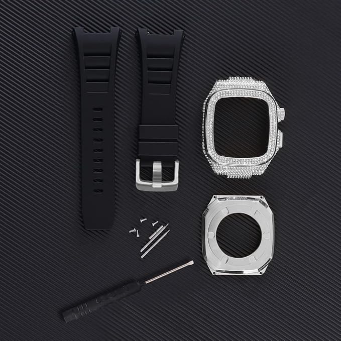 ステンレススチール ストロングアーマー ウォッチケース + キラキラダイヤモンド + シリコンバンド Apple Watch 44mm 45mm用 (ブラック+シルバー)