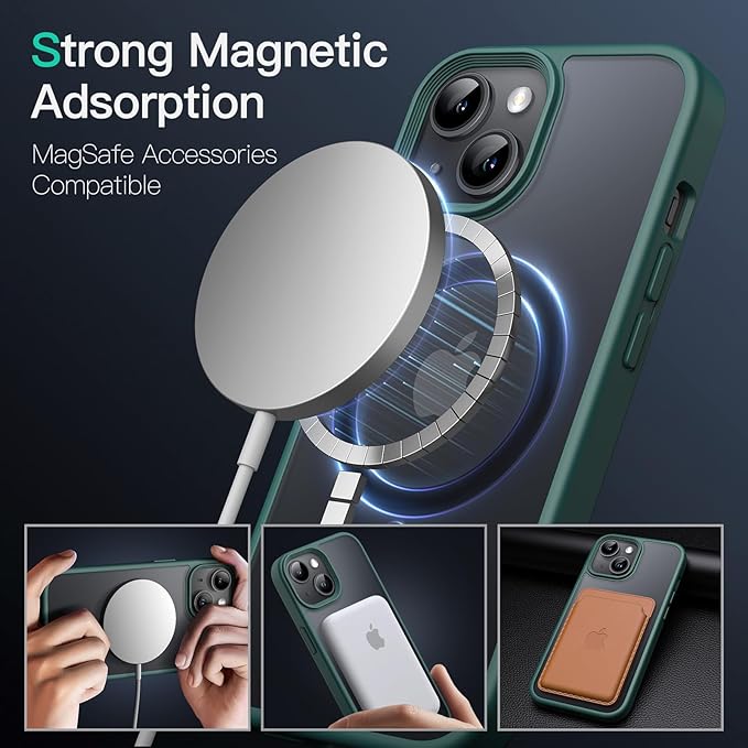 JETech iPhone 15 6.1インチ用 マグネット ケース MagSafeに対応 半透明のマット背面 薄型 耐衝撃 カバー (濃い緑色)