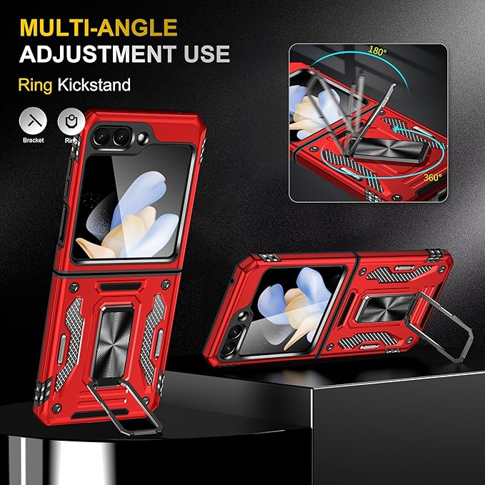 Galaxy Z Flip5 用ケース リング付き スライド式カメラカバー 耐衝撃 スタンド機能 車載ホルダー レンズ保護 ギャラクシー Z フリップ5 用スマホケース PC TPUバンパー 防塵 人気 落下防止 滑り止め 指紋防止 携帯カバー 赤 K49