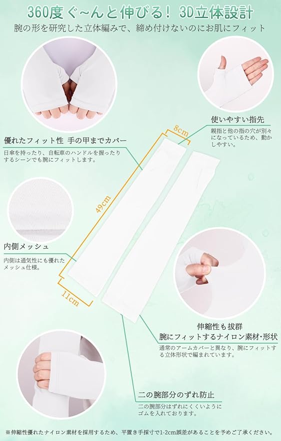 【接触冷感でひんやり】ひんやり涼しい冷感アームカバー、接触冷感で涼しく快適です。接触冷感材質を採用して、水や汗で濡れると気化熱の作用により冷却効果があり、肌と接触した瞬間に温度を3−5度を下がる涼しいと感じます。夏のお出かけには不可欠なアイテムです。