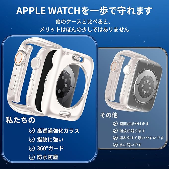 【360ど度防水】Apple Watchケース特殊加工による防水機能により、 手を洗う時はもちろん汗をかいた時、シャワーを浴びた時にもかかわらずにアップルウォッチをご使用できます。 ※アップルウォッチ本来の防水性能を向上させるものではありません。プールや海などの水場でのご使用時はアップルウォッチの説明に従い、スキューバダイビング、ウォータースキーなど、水圧が高くなったり、所定の水