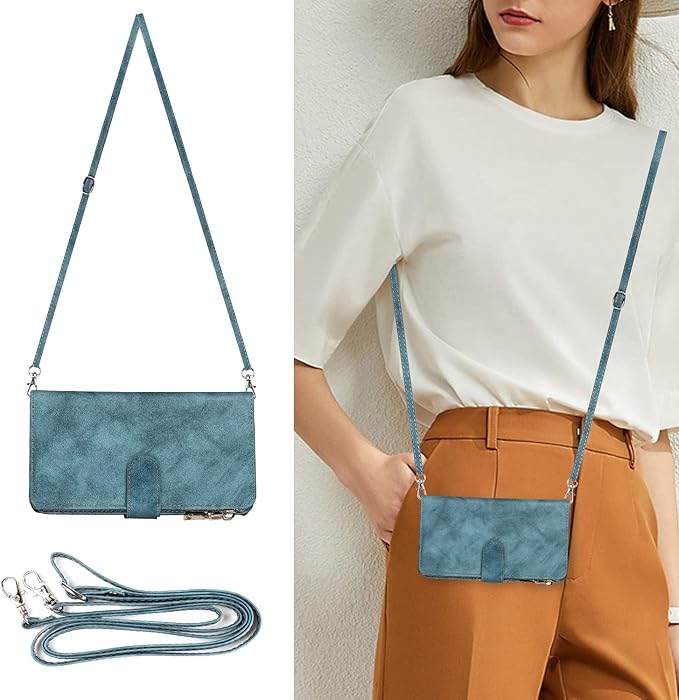 Pelanty for iPhone 15 Pro 縄掛けケース 手帳型ケース 携帯カバー 肩掛け首かけ斜めがけ ショルダー 合成皮革 + TPUケース 内蔵マグネット iPhone 15pro 財布型カバー ICカードポケット お札入れ小銭入れ 大容量 収納ポケット きスタンド機能 アイフォン15 pro 6.1インチ ストラップ付き 落下防止 耐衝撃(肩縄付き-ブルー)