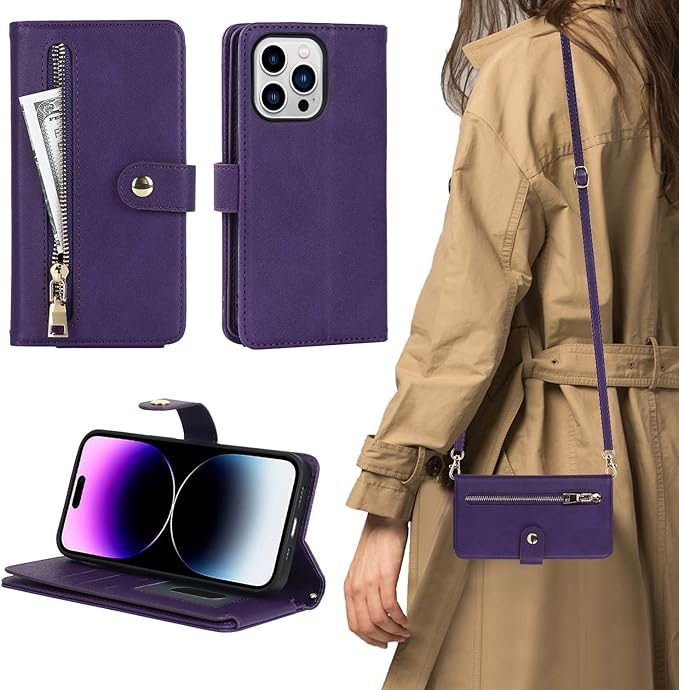 Eastwave アイフォン For iPhone 15 Pro Max ケース 手帳型 For iPhone15promax 縄掛けカバー 手帳 For iPhone 15promax case 長ストラップ付き 肩掛け 革レザー 柔らかいTPU 財布型 カード収納 小銭入 れ スタンド機能 落下防止 5色 ダークパープル