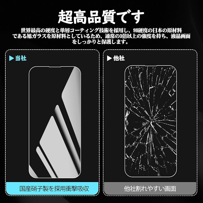 【9H硬度・日本製ガラス素材】日本旭硝子製ガラス素材採用 最上級強度のガラスを使用し表面硬度は9H。万が一スマホを落としてガラスが割れても、 ガラス破片が飛び散らないような安心設計。 飛散防止 、ガラス破片から守ります。