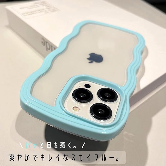 saymi ウェーブ デザイン 韓国 iPhone15 ケース パステルカラー 全6色 波型フレーム おしゃれ 透明 クリア 可愛い くすみカラー うねうね なみなみ 手にフィット (iPhone15, スカイブルー)