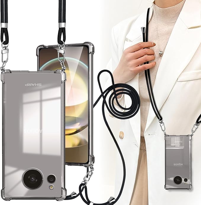 AQUOS R8 ケース ショルダー クリア SH-52D カバー 耐衝撃 TPU 肩がけ 首掛け 紐付き 薄型 縄掛け ケース 斜めかけケース 軽量 取り外し可能 調節可能な ショルダー 肩がけ 首掛け 紐付き 透明+縄掛け-ブラック 08009-R8-01
