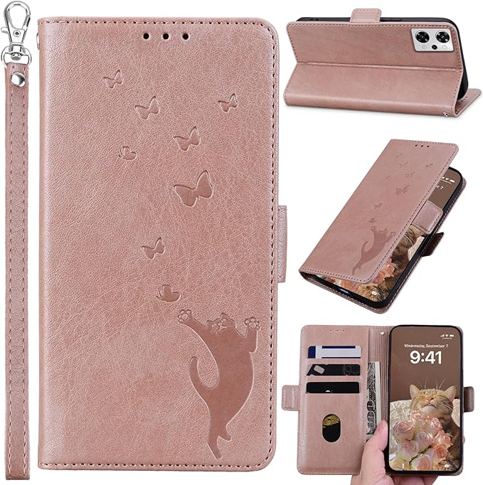 OPPO Reno9 A ケース 手帳型 OPPO Reno7 A ケース 手帳型 oppo reno9 a 手帳型ケース おっぽ スマホ reno9 a ケース スマホケース oppo reno7 a 蝶と猫の3Dパターン スタンド キャッシュポーチ リストストラップ プレミアム耐久性PUレザー 強い磁気吸引 リストストラップ 落下防止 opporeno9a ケース[ローズゴールド]