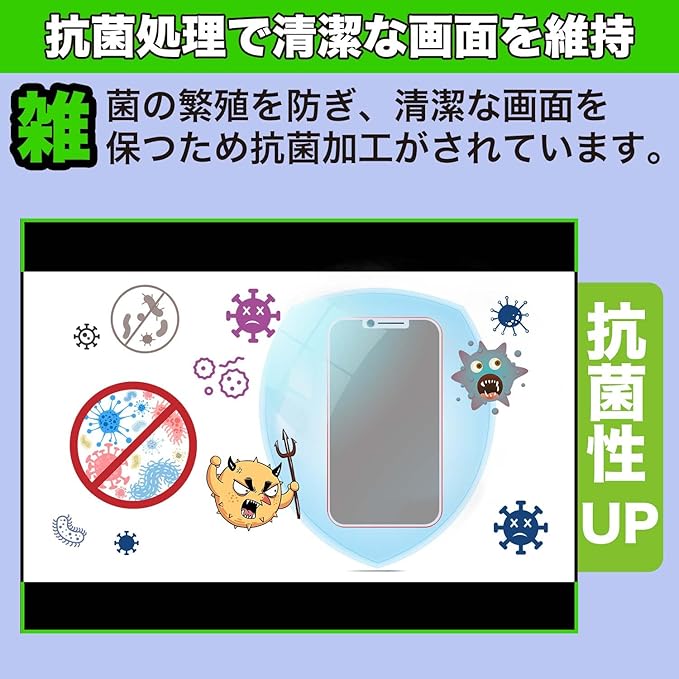 指紋防止 :指紋や汚れから 画面をしっかり守ります。帯電防止仕様なので埃も付きづらいです。抗菌性 :フィルムの表面で雑菌が繁殖するのを防ぐための抗菌加工がされているので、清潔な状態を保つことができます。