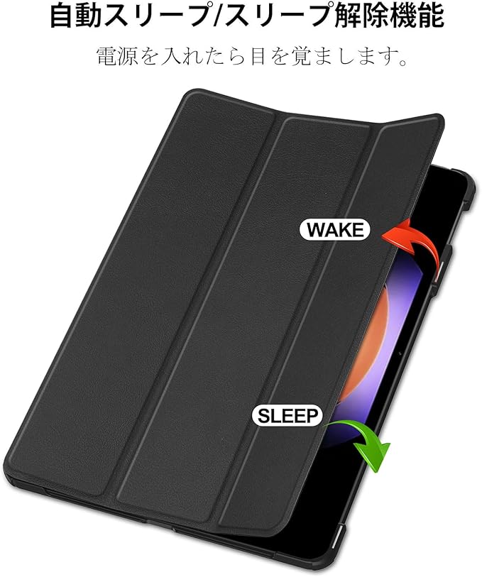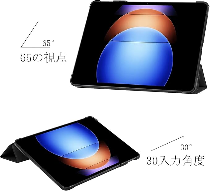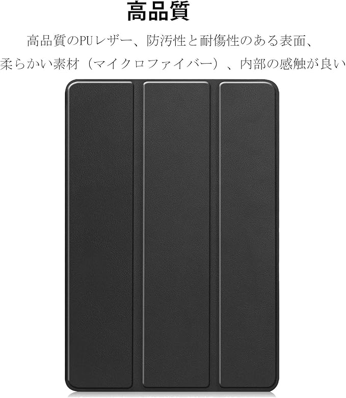 【三つ折りスマートカバー】マグネット内蔵で、オートスリープとウェイクアップの機能を実現します。磁気フロントカバーを折りたたんで鑑賞モードやタイピングモードにすることができます。