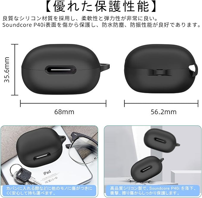 PRODELI For Anker Soundcore P40i 専用 カバー 耐衝撃 シリコン素材 カラビナ付き 紛失防止 キズ防止 柔らかい 装着充電可能 防塵 軽量 soundcore p40i 用 保護カバー (ブラック)