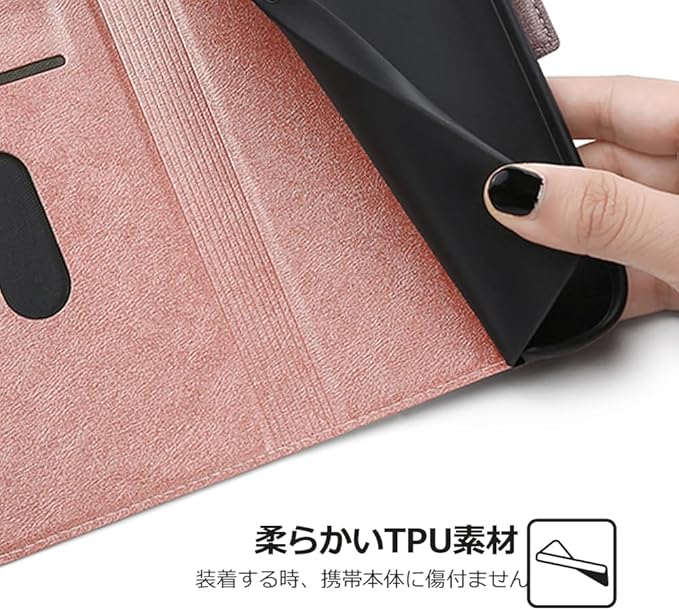 「スタンド機能&装着便利」レザーケースの内面にソフトケースで装着簡単、素材には合皮レザーが使われており、おしゃれなデザインが特徴です。さらに、ケースを折って立たせることで、スマホスタンドとしても利用することができます。