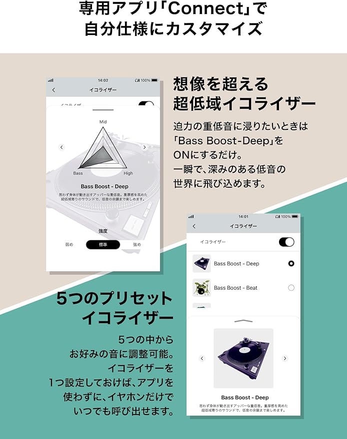 技適マーク認証済み商品(周波数帯:2.4GHz帯)圧倒的な低域表現と好きを極めるノイズキャンセリング:独自設計のφ9mm ドライバーと、空気の流れをコントロールする音響スペースとダクトを配置。圧倒的な重低音とバランスの取れた中高域を両立し、日常的にライブにいるかのような臨場感で音楽や動画を楽しむことができます。ドライバー背面に、空気の流れをコントロールするための音響スペースとダクトを配置。理想的なドライバーの動きにより、低域の量感を楽しめます。フィードフォワード式のアクティブノイズキャンセリング機能を搭載。おうちの空調音や 通勤通学時の電車やクルマの走行音など、あなたの周りのノイズを抑えて、大好きな音楽 や動画に一瞬で夢中になることができます。