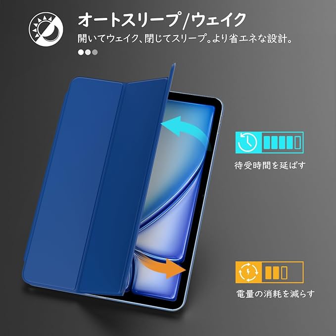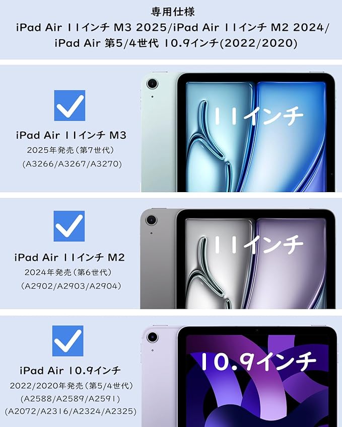 「対応機種」2025年発売のiPad Air 11インチ(M3)(モデル番号:A3267、A3270)、2024年発売のiPad Air 11インチ(M2)(モデル番号:A2902、A2903、A2904)、2022年発売のiPad Air 第5世代(モデル番号:A2591、A2589、A2588)及び2020年発売のiPad Air 第4世代(モデル番号:A2316、A2324、A2325、A2072)10.9インチタブレットにカスタム設計しており、iPad(A16)第11世代 11インチ(×